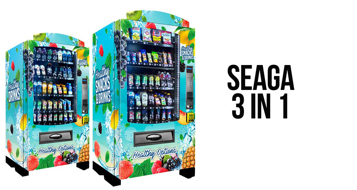 The 3 in 1 Seaga machine is built in the USA and give you the options of having a full snack machine, drink machine, or combination of snack and drink machine. Entirely refrigerated and glass front that can vend not only your cold drinks, but also perishable foods like yogurt, burritos, or other entrees.